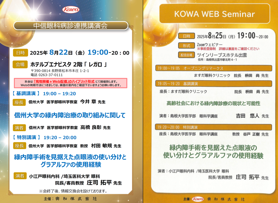 松本市と出雲市で講演を行いました event_note2025.09.25 local_offer学会・講演 2025年8月22日に長野県松本市で、25日には島根県出雲市で講演をさせていただきました。 松本での講演のあとは懇親会があり、信州大学の村田敏規先生、平野隆雄先生をはじめ、緑内障をご専門とされる先生方とお話しすることができました。 日々の診療や研究について率直に意見交換ができ、とても充実した時間になりました。 出雲では講演の前に島根大学病院を見学し、医局会にも参加させていただきました。 新しく拡張された眼科外来は、検査機器が充実していながらもゆったりとしたつくりで、とても印象的でした。 講演のあとには医局の納涼会にも参加し、先生方と楽しく交流させていただきました。 今回の訪問を通じて、各地での診療体制や取り組みを直接学ぶことができました。この経験を自院の診療にも活かし、より質の高い医療を提供できるよう努めてまいります。